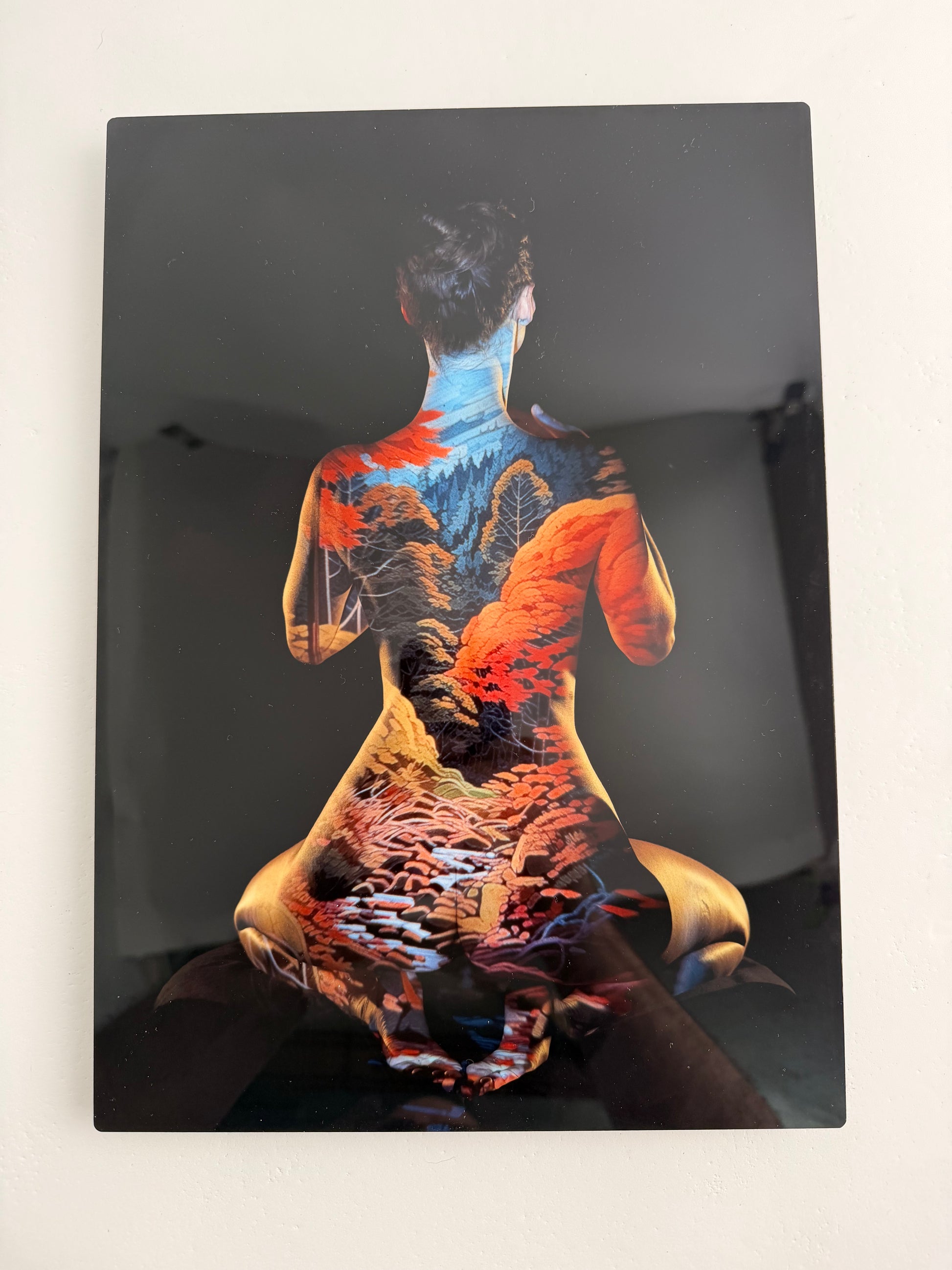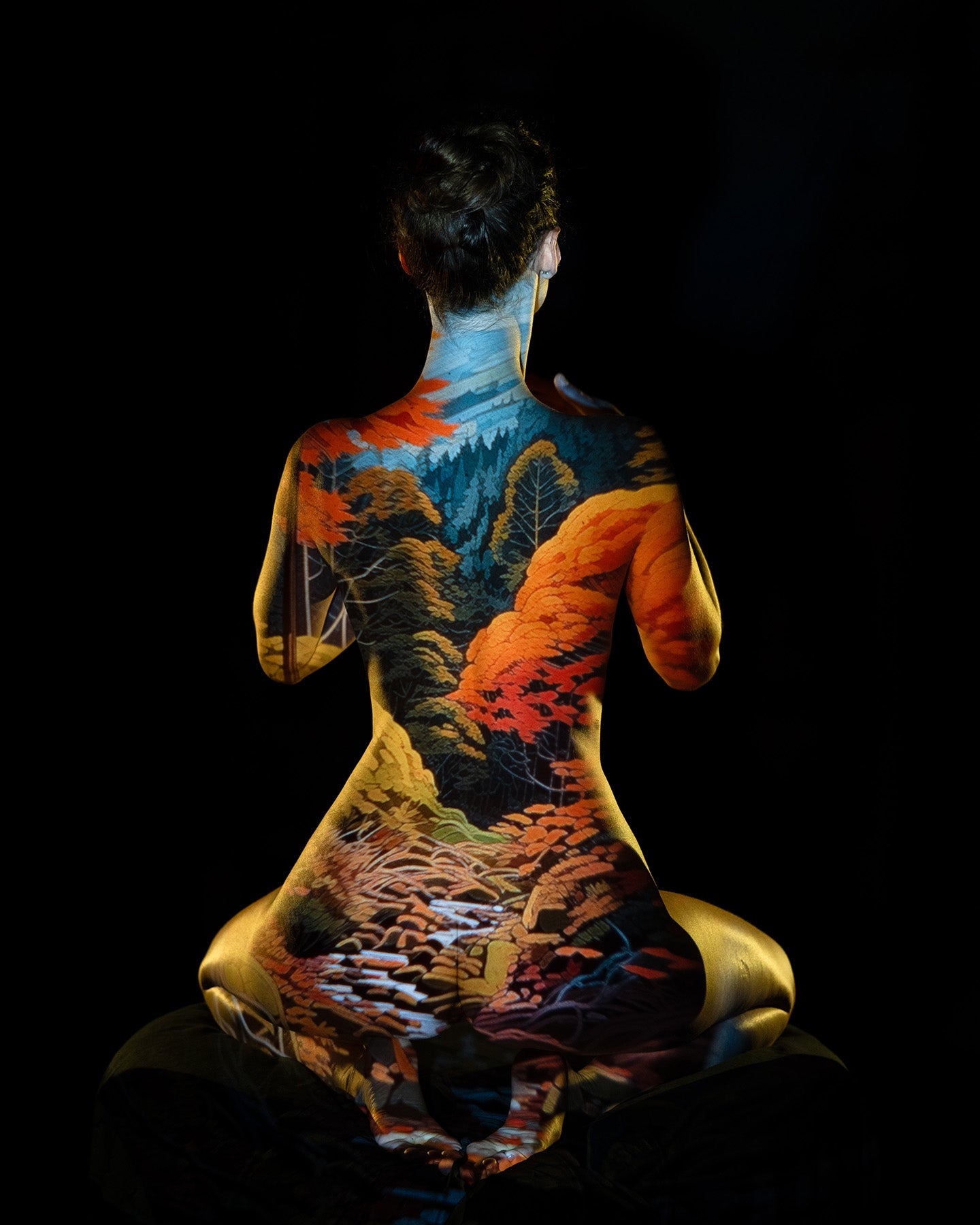 The body becomes a canvas, and nature tells its story. Projected forests and winding paths flow across the form, blending human presence with the quiet beauty of the natural world.